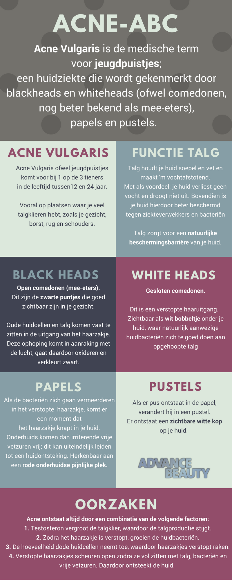1. Er wordt – onder invloed van hormonen – zó veel talg geproduceerd, dat de opening van binnenuit verstopt raakt.