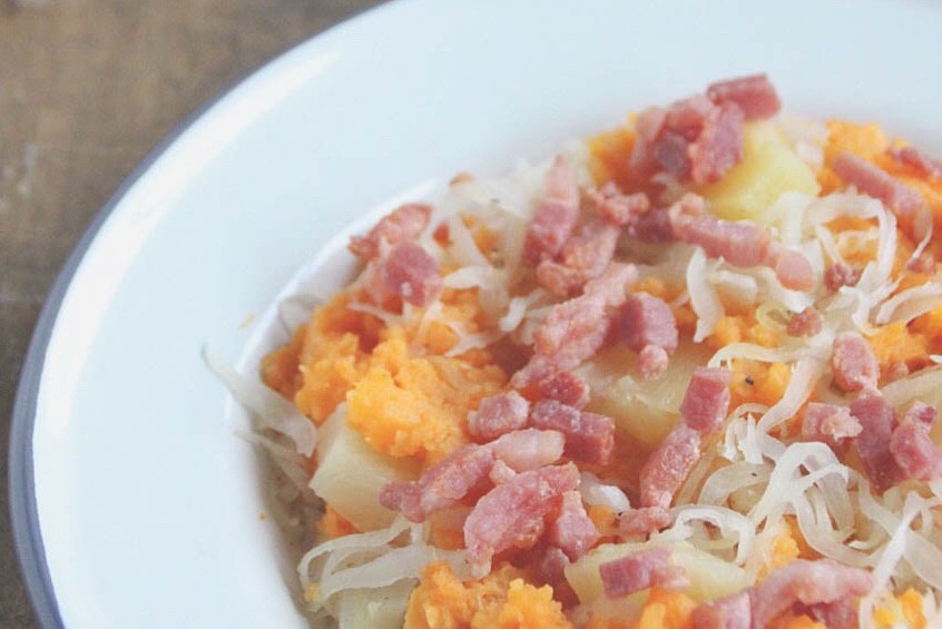 ZUURKOOLSTAMPPOT MET ZOETE AARDAPPEL EN ANANAS