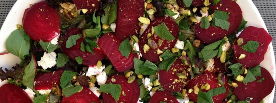 SALADE VAN RODE BIETJES MET GEITENKAAS EN PISTACHENOOTJES